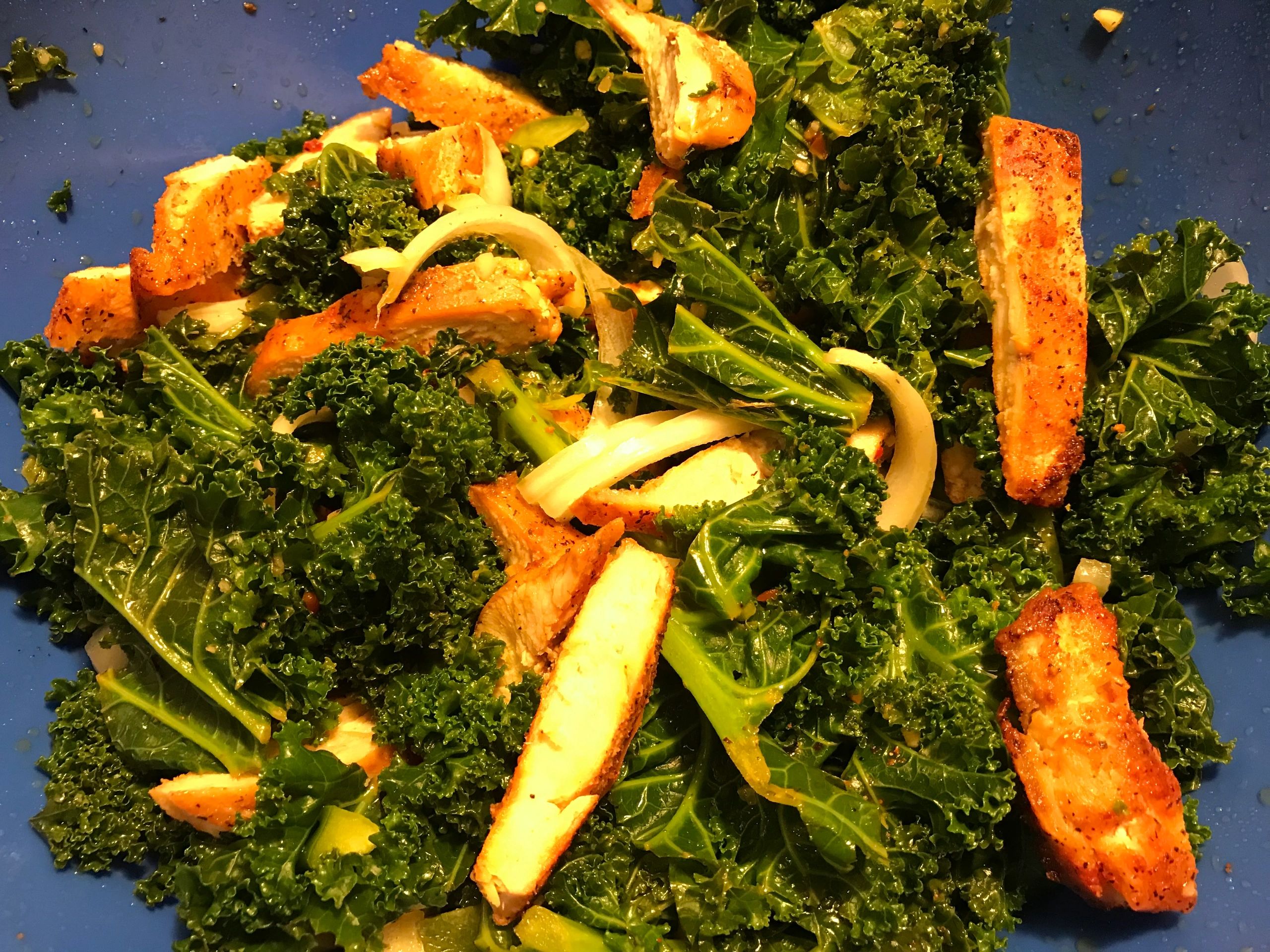 Grilled or fried chicken breast served over a bed of steamed kale, mixed with an array of onions and tri-colored peppers (may include pineapple chunks).